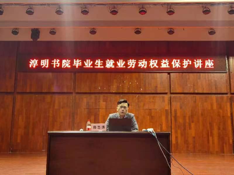 郑志涛就毕业生就业劳动权益保护进行讲解。他以劳动合同法为主要内容,向毕业生讲述如何在就业过程中运用法律维护自己的合法权益,讲解了“合同的主体、合同权利与义务、违约金的设立、合同的接触”等内容,结合身边生动的案例,告诫同学们要谨防劳动合同陷阱,维护自身劳动权益,给同学们上了一堂别开生面的法律课。
