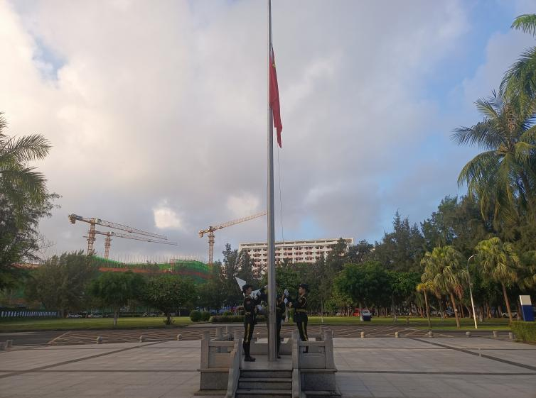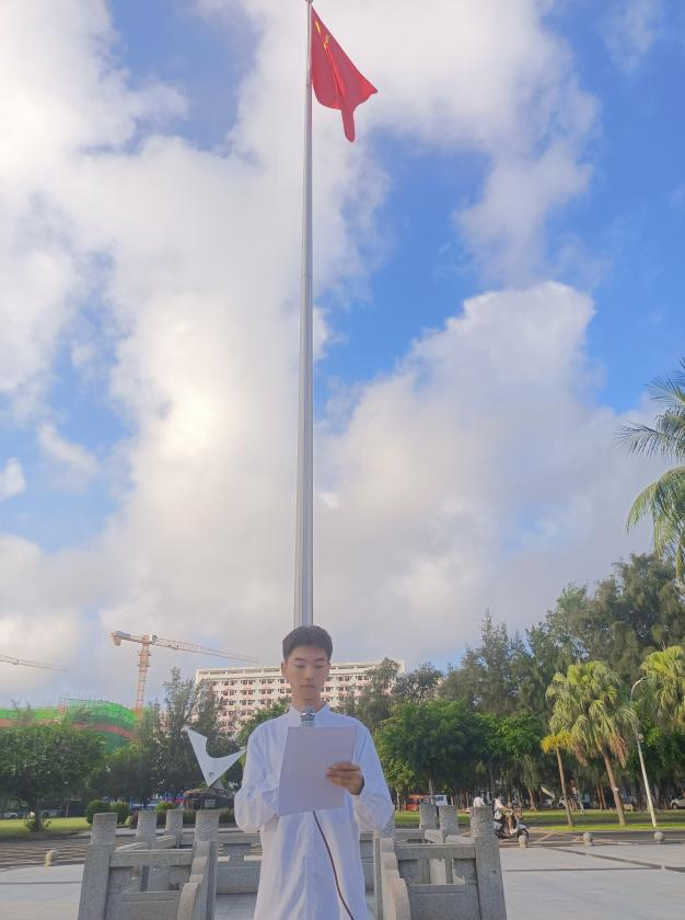 伴随着庄严肃穆的国歌声,五星红旗缓缓升起。同学们整齐列队,高唱国歌,向国旗行注目礼。在“国旗下的讲话”环节中,学生代表裴一鸣做了题为“学习党的二十大 建功自贸港”的发言。他从“高举伟大旗帜 奋进伟大征程”、“接续时代创伟业 青春激扬自贸港”、“砥砺前行勇担当 同频共振新青年”三个部分指出大学生应该秉承爱国、奉献、励志、创新的精神,为实现中华民族伟大复兴的中国梦做出自己的贡献。他还倡议大家从身边小事做起,注意交通安全、谨防电信诈骗、远离套代购等违法行为,在逐梦自贸港的火热实践中,绽放绚丽的青春之花。