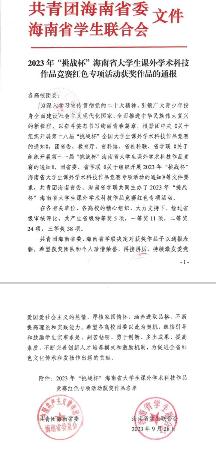 近日,由共青团海南省委、海南省学生联合会通报的2023年“挑战杯”海南省大学生课外学术科技作品竞赛红色专项活动获奖作品中,william威廉亚洲官方学生作品分别荣获特等奖一项、一等奖一项、二等奖一项、三等奖一项的佳绩。