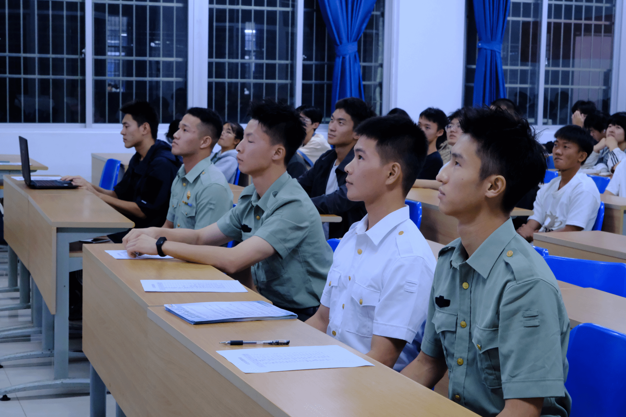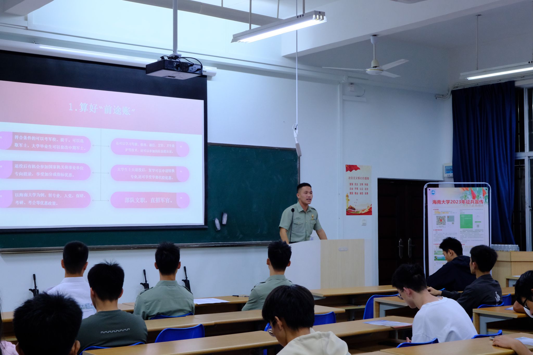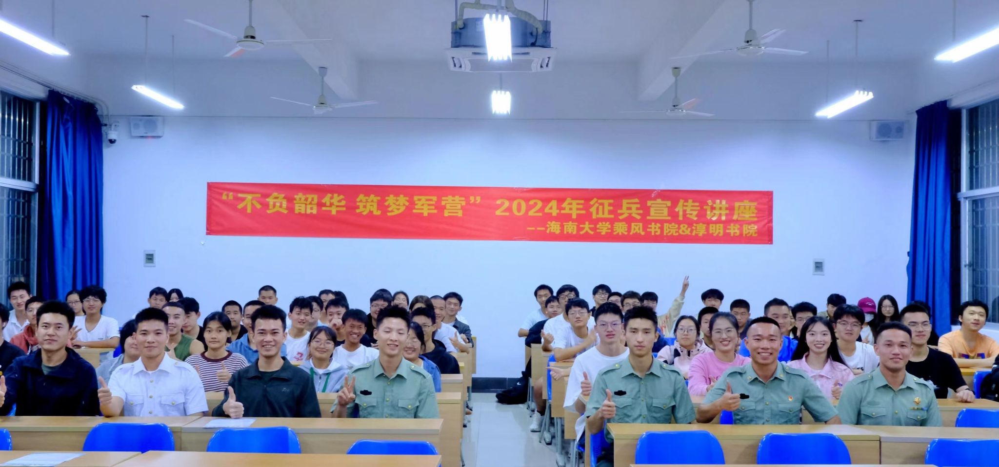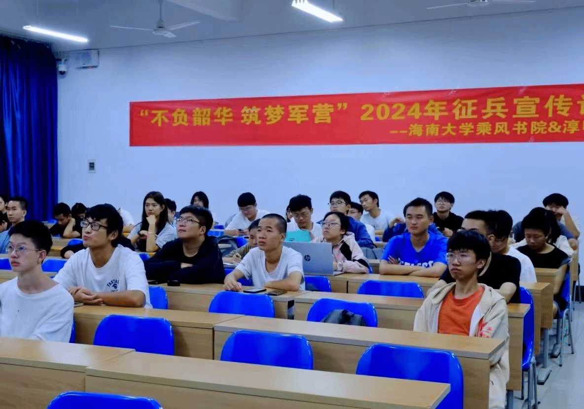 从戎报国志,青春正当时。为进一步加强国防教育,加大征兵宣传力度,普及征兵政策,鼓励海大学子响应国家号召积极应征入伍,12月8日晚,我院与乘风书院联合在五教110教室开展征兵宣讲活动。退伍大学生罗木生、蒋奇峰、张恩泽、符首创、陈善炜、叶京安担任宣讲嘉宾,来自两个书院的有意参军学生参会。