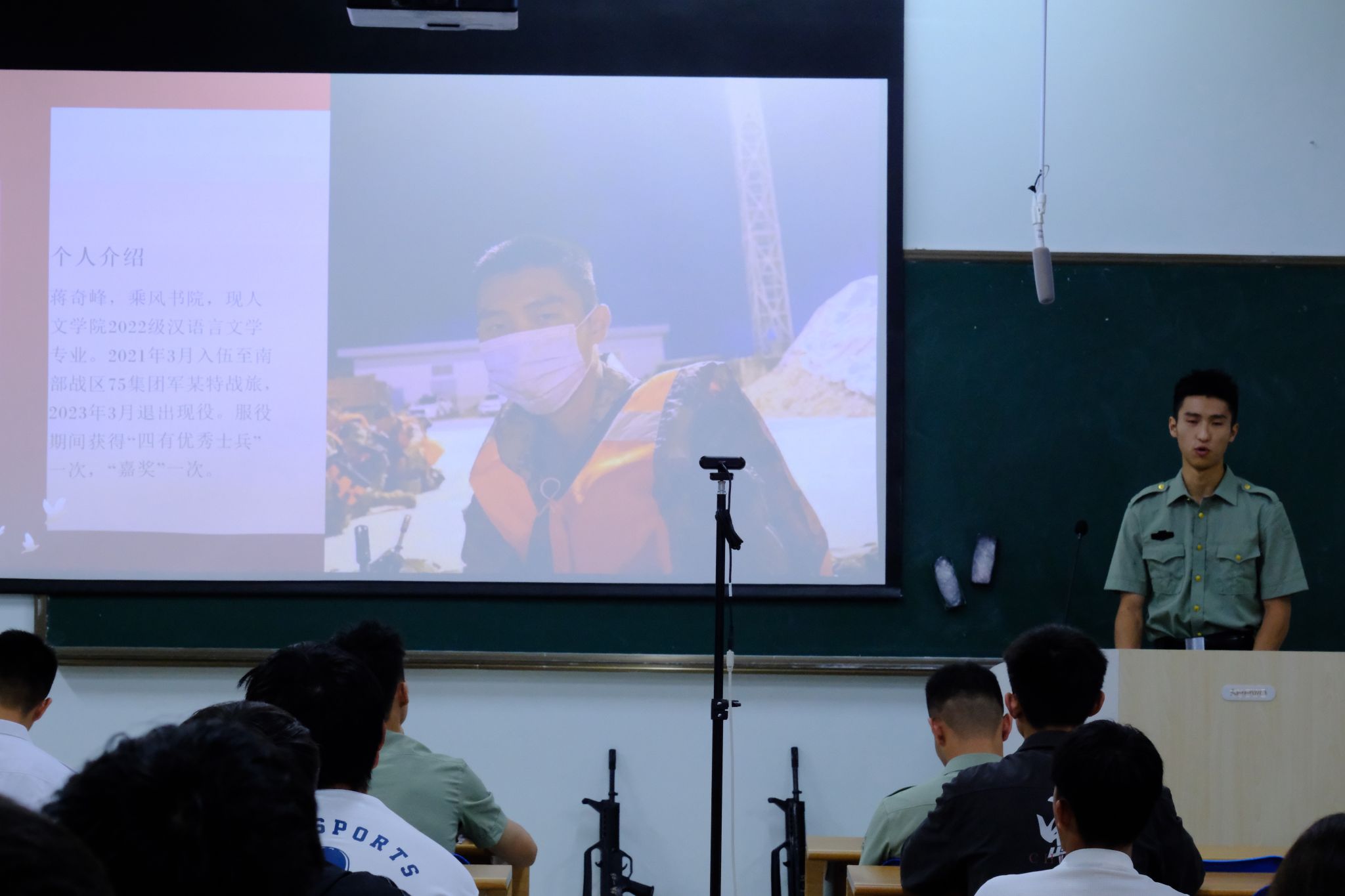 蒋奇峰着重介绍了军旅生涯中的训练情况和宝贵战友情。他鼓励大学生们勇于突破自我,把入伍作为人生中辉煌的经历和提升个人体能素质的难得机会。