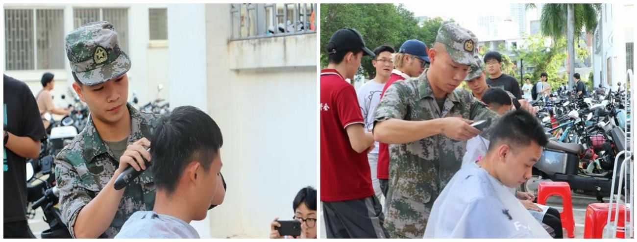 他们还化身为“发型师”,义务为同学们理发。兵哥哥们技艺娴熟、服务周到,为同学们精心打造时尚发型,广受同学们一致好评。