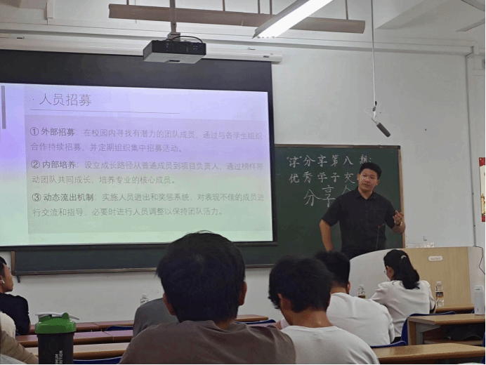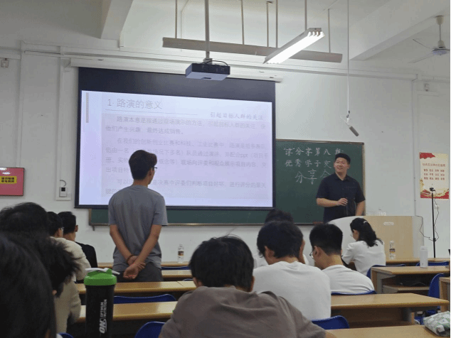 分享交流会上,商文楷学长从赛事技巧和赛事初心两大方面分享了他的参赛经历和感悟,详细介绍了项目团队成员的组建、商业计划书撰写、ppt制作、路演演讲、答辩等5个环节的注意事项和准备技巧,引导同学们要合理规划项目进程,扎实开展实践,按照比赛评审要点做足准备。他鼓励同学们在学习、科创实践中要受得住苦难,耐得住寂寞,存得住信念,争取取得更好的成绩。