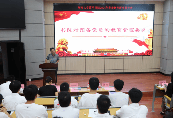 陈泽锐代表书院对预备党员作教育管理要求。他指出预备党员要时刻牢记自己的身份和使命,遵守党纪党规,以更高的标准严格要求自己,在学习、工作和生活中发挥先锋模范作用,树立好党员形象。
