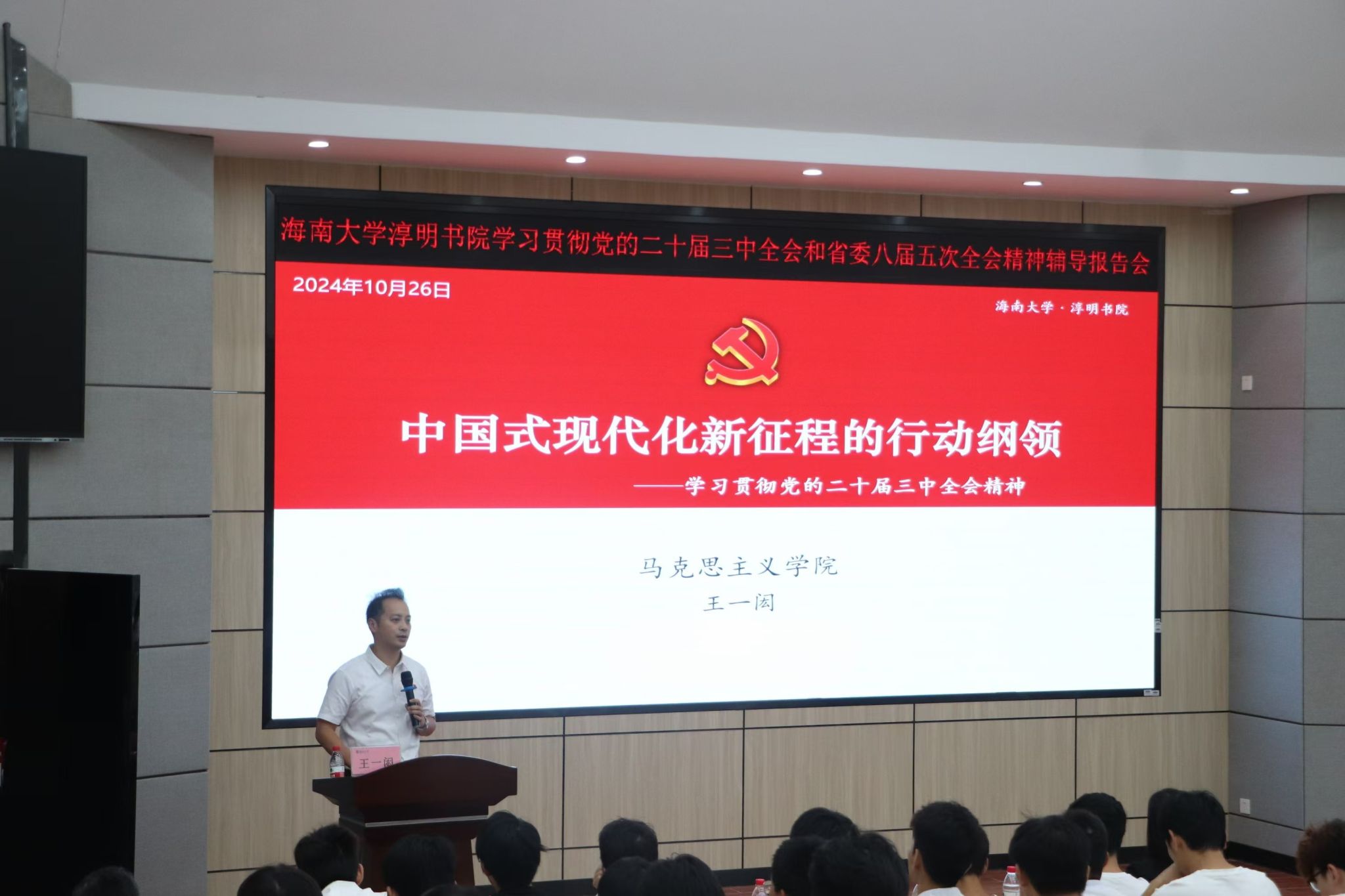 2024年10月26日下午,海南大学william威廉亚洲官方在邵逸夫学术交流中心举办william威廉亚洲官方青年思政大讲堂。本次讲堂邀请海南大学马克思主义学院副院长王一闳作题为《中国式现代化新征程的行动指南——学习贯彻党的二十届三中全会精神》的报告,william威廉亚洲官方党委书记周郭军、副书记武琼、书院全体辅导员以及书院学生党员代表、学生骨干代表共计200余人参加此次讲堂活动。