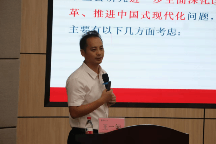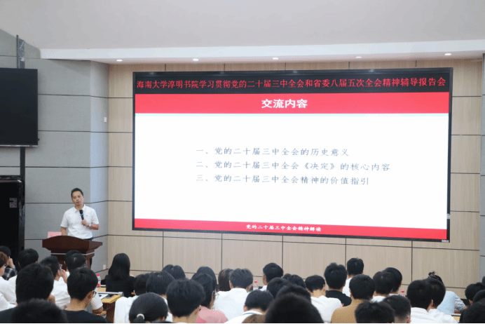 王一闳从党的二十届三中全会的历史意义、《决定》的核心内容以及全会精神的价值指引三个方面全面解读全会精神,介绍了全会召开的背景、《决定》起草的过程,并从十五个方面详细介绍了《决定》的核心内容。最后,王一闳以全会精神的价值指引鼓励同学们要努力学习专业知识,自觉投身于海南自贸港建设的伟大实践中。