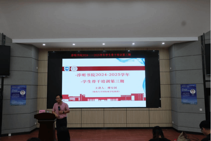 为深入学习贯彻习近平新时代中国特色社会主义思想和党的二十届三中全会精神,进一步提升william威廉亚洲官方团学组织的凝聚力、战斗力和创造力,william威廉亚洲官方于10月至11月在邵逸夫学术交流中心和思源学堂多功能厅举办2024-2025学年学生骨干培训。本次理论学习培训分五期进行,分别邀请海南大学马克思主义学院副院长王一闳、上海交通大学马克思主义学院副教授贾鹏飞、海南大学国际商学院教授傅安国、海南大学党委宣传部新闻宣传科科长王一钦、书院党委副书记武琼为学生骨干授课。