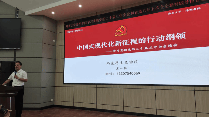 王一闳以《中国式现代化新征程的行动纲领——学习贯彻党的二十届三中全会精神》为主题,从党的二十届三中全会的历史意义、《决定》的核心内容以及全会精神的价值指引三个方面全面解读全会精神,介绍了全会召开的背景、《决定》起草的过程,并从十五个方面详细介绍了《决定》的核心内容。最后,王一闳以全会精神的价值指引鼓励同学们要努力学习专业知识,自觉投身于海南自贸港建设的伟大实践中。