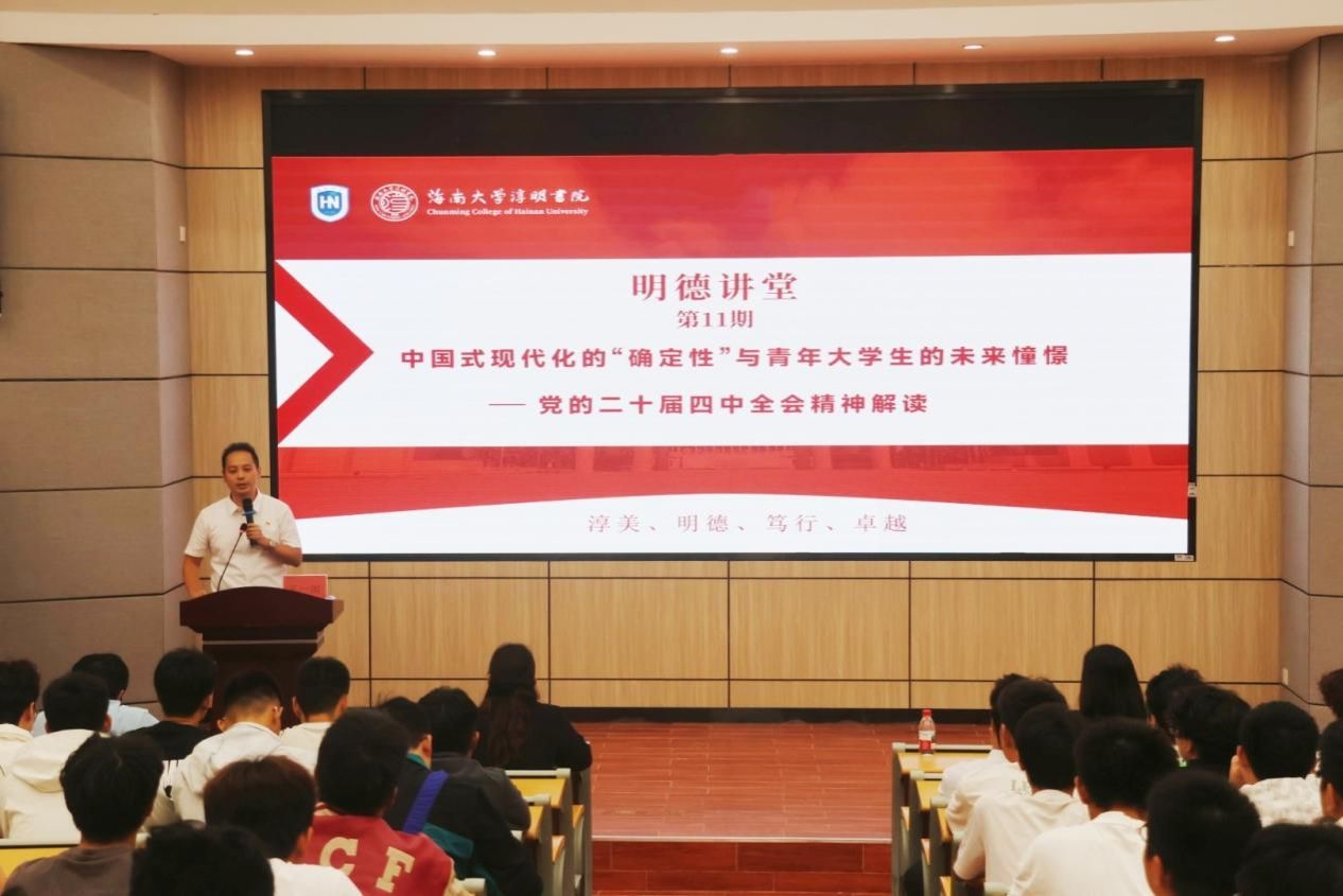 为进一步深入学习贯彻党的二十大及二十届四中全会精神,10月25日上午,william威廉亚洲官方第11期“明德”讲堂在学校邵逸夫学术交流中心1111报告厅举办。本期讲堂邀请海南大学马克思主义学院副院长、博士生导师、海南省拔尖人才王一闳授课,书院200余名师生参加讲座。