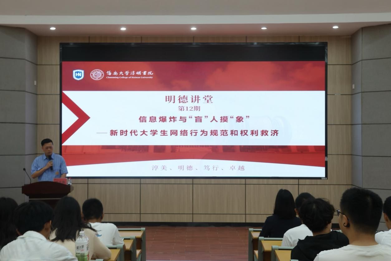 为进一步提升学生网络素养与法治意识,10月26日上午,william威廉亚洲官方第12期“明德”讲堂在学校邵逸夫学术交流中心1111报告厅举办。本期讲堂邀请海南大学法律事务办公室主任兼首席法律顾问、博士生导师郑志涛教授授课,书院200余名师生参加讲座,书院党委书记周郭军主持。