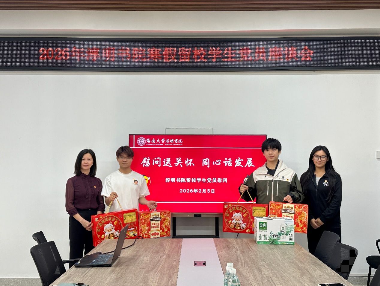 活动最后,书院党委为党员同志送上新春慰问品。此次座谈会既传递了组织温情,又搭建了高效沟通桥梁,进一步增强了党组织凝聚力,助力留校学子度过安全充实的寒假。