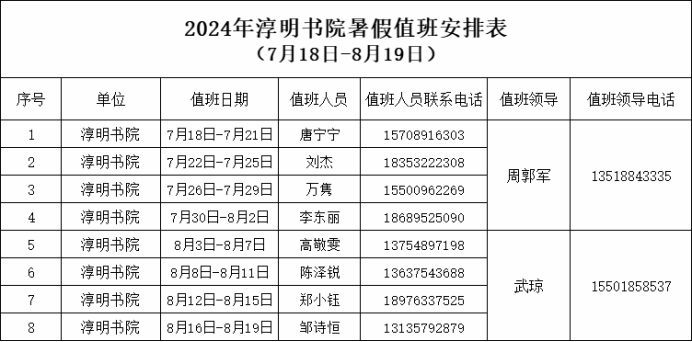 暑假期间,全体辅导员均继续保持24小时手机畅通,每天均有辅导员值班。同学们如有紧急情况,可及时联系值班辅导员或楼层辅导员。具体值班安排表如下: