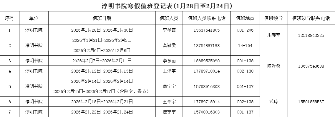 寒假期间,全体辅导员均继续保持24小时手机畅通,每天均有辅导员值班。同学们如有紧急情况,可及时联系值班辅导员或楼层辅导员。具体值班安排表如下: