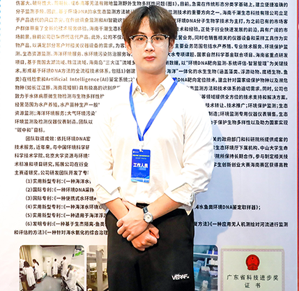 2022年12月,他助力创办推广环境DNA检测技术的千潮公司,推动千潮公司入驻三亚崖州湾科技城南繁众创中心。他在该公司推广环境DNA检测技术过程中,探索“先发现DNA——再寻找珍稀物种”的生态检测新模式。2022年8月至2023年10月,利用该技术先后在深圳市大鹏新区发现国家二级保护动物香港瘰蝾;在海南热带雨林公园发现国家二级保护动物唐鱼;在三亚市蜈支洲岛海洋牧场构建珊瑚生态系统环境DNA数据库等。至今已在全国7个省份开展生态环境检测,足迹遍布全国20余条河流,进行病原菌防治20余次。公司先后获“国家科技型中小企业”“海南省科技型中小企业”等荣誉称号。