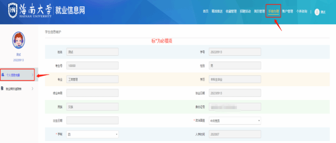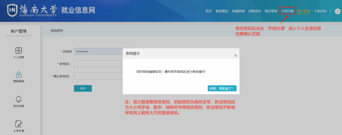 (1)网页端(海南大学就业管理服务平台 https://jyxt.hainanu.edu.cn/a/login):系统登录 - 手续办理 - 问卷调查 - 个人信息完善确认。